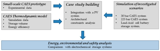 Few research projects were funded in the storage field, since the main reason for such a strategy belongs to the renewable electricity excess, which is still not codified by the regulations of most countries [14]. As a matter of fact, storage is identified as a solution only if it is approved by grid owners, since the stored renewable electricity does not have priority on the market, and it risks being a shock for established market mechanisms [15,16]. Referring to CAES solutions, a great proportion of the studies coupled the simulated data of CAES with simulated or actual data of the end user such as a dwelling or a larger building. Only one study proposed an economic modelling [17]. CAES was taken into account in the feasibility study for building energy retrofitting, [18] but the constraints due to architectural values and a lack of space caused it to be forgotten by many historic building refurbishment interventions [19]. Moreover, the debate between restoration professionals and energy engineers delayed the introduction of innovative solutions [20] and favored conventional approaches such as internal insulations or PV array installations on roofs [21]. Furthermore, the rising request of eco-friendly [22] or even circular materials makes the refurbishment action more difficult [23].