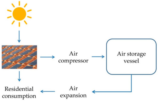 The system is assumed to complete daily cycles, constituted by a compression phase and a production phase. The PV array firstly supplies energy to users. The excess power is used to compress air. The energy absorbed by the compressor is calculated according to Equations (1)–(4).
