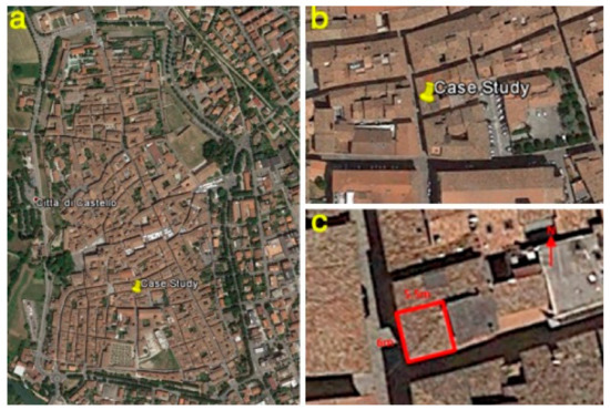 Experimental and simulation data are applied to a case study building, which is a residential building in Città di Castello, a city located in Central Italy (43°28′12″ N 12°13′53″ E) that has a very long history and whose historical centre is delimited by historical walls. The selected residential building is positioned within the historical walls, within the historical center. It is a three-storey building (a ground floor, first floor, second floor, and an attic) with a total area of 280 m2. The aerial view of the historical centre and the case study building is shown in Figure 4. The available roof surface for PV installation is about 33 m2. The sloped roof has an inclination of about 20°.
