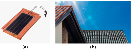 However, there are Italian standards to obey for the installation of PV systems in historical centers: in particular, the installation of PV systems is allowed if no visual impact and a perfect architectural integration are ensured. In light of the above-mentioned rules, to our purposes, the installation of photovoltaic roof tiles (Figure 5) Ma.Xi.Ma by Industrie Cotto Possagno has been selected. The PV-equipped tile is composed of a terracotta tile integrated with a PV module in monocrystalline silicon. It takes a surface of about 10.5 m2 to install a 1-kWp system with 1000 Wm−2 solar insolation [42].