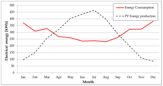 Figure 6 shows the total estimated PV energy production, given by the sum of the southeast-oriented PV system and northwest-oriented PV system (Table 2), and the energy consumption was registered in 2016. In particular, building energy consumption has been yearly monitored, and data from domestic meters have been collected.
