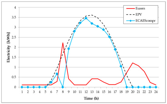 Excess PV energy for the air compression phase is available in the morning, except for the consumption peak at 8 am, and during the day until 6 pm (Figure 7). During the rest of the day and into the night, solar energy is not produced, and therefore, air expansion should be activated.