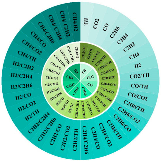 The above listed DGA sets all rely more on expert individuals’ experience rather than rigorous calculation of mathematical models. Therefore, it is still unclear that whether DGA gases or DGA gas ratios or hybrid DGA features (DGA gases and gas ratios) is most relevant to the fault types of power transformer. As shown in the Figure 1, we defined three types of feature sets to compare the relevance of three make sure the most relevant feature set and screen out the most effective features. The inner ring in Figure 1 depicts the feature set (FS1), including eight basic dissolved gases (The TH is the sum of CH4, C2H2, C2H4 and C2H6, which is related to faults of transformers [22]). The middle ring in Figure 1 illustrates second feature set (FS2), including 28 DGA gas ratios. The outer ring in Figure 1 represents the third feature set (FS3), which consist of 36 hybrid DGA features (eight basic dissolved DGA gases and 26 DGA gas ratios).