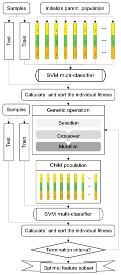 Based on three feature sets defined, we build a “genetic-algorithm-SVM-feature-screen” (GA-SVM-FS) model to screen out the optimal feature subset of each feature set. The flowchart of GA-SVM-FS model is depicted in Figure 2, the process of feature screen consists of three major steps.