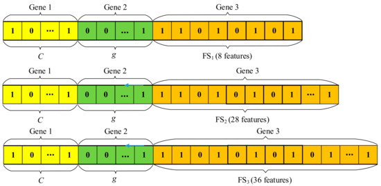 As shown in Figure 4, by converting the binary code of “Gene 1” and “Gene 2” into decimal data, we can obtain the values of C and g which are used to build the SVM multi-classifier. The feature subset can be selected by choosing the features whose bit in “Gene 3” are “1”. We used the feature subset as the input of SVM multi-classifier to calculate the fitness of chromosome. Here, we used the accuracy of k-fold cross-classification (k-CV) of transformer fault training samples as the individual fitness function, which can be calculated as follows: