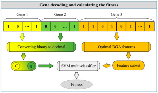Genetic algorithm is widely in many fields. As shown in Figure 3, each chromosome is comprised of three genes, which use the binary codes represent the C, g, and DGA features, respectively. The length of binary coding of “Gene 1” or “Gene 2” is determined by its numerical boundaries, which are both set to 10. By converting the binary code to decimal, the values of C and g can be obtained. The length of “Gene 3” is the number of DGA features, which are equal to 8, 28, and 36 to represent three feature sets, respectively. In “Gene 3”, the bit which is 0, represents the corresponding DGA feature is not selected, otherwise it is selected.