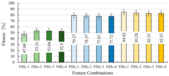 Based on the 118 fault samples in IEC TC 10 database, each type of feature set was optimized 100 times. We screened out the top four feature combinations for each type feature. As shown in Table 2, Three types of feature sets (FS1–FS3) were represented by green, blue, and brown color, respectively. The grey shaded areas represent corresponding features are not included in the feature set. The checks filled with color represent the features were selected, and all selected features in a column constitute a feature subset. We used different shades of color to distinguish different feature subsets screened out from same feature set. The FSSi-j represented the jth feature subset screened out from FSi. The average accuracies of 12 feature subsets are shown in Figure 5.
