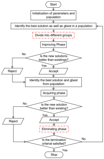 However, in the standard SGO, since the persons (candidate solutions) are only sorted into one team, each person can only acquire knowledge from the one team leader in this group, which may cause the algorithm to fall into local optima. Furthermore, the weakest person in each generation is not improved, which is not conducive to explore more potentials. Hence, to improve the performance of the SGO, an improved SGO (ISGO) is proposed in this study. Figure 6 depicts the procedure of ISGO, in which the following two steps (steps in red dashed boxes) have been added oton the standard SGO.