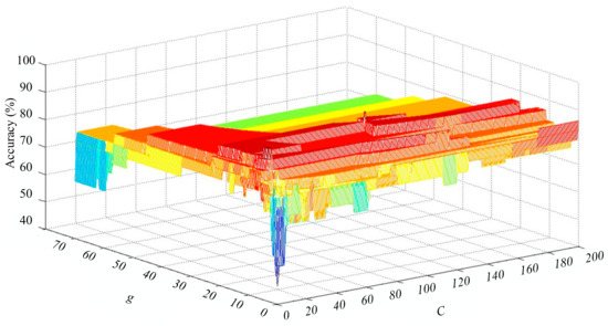 Figure 11 illustrates the relationship between C, g, and diagnostic accuracy with a Cartesian coordinate system in three dimensions, in which the X-axis, Y-axis, and Z-axis represent C, g and diagnostic accuracy, respectively. The larger the value of Z-axis, the higher the accuracy is (i.e., the deeper the red (blue) color is, the higher (lower) the accuracy of diagnosis is). From Figure 11 we can tell that the values of SVM parameters can significantly influence the accuracy of fault diagnosis. For example, the accuracy can be very low when (C, g) is near the origin (0, 0), but very high when (C, g) near the origin (10, 9). In addition, there were no specific laws can be summed up between SVM parameters and diagnostic accuracy, though there might be a general trend of “step up and then down” along the diagonal line from the origin. Therefore, the optimization for SVM parameters is necessary to obtain a better performance of classification of faults. Such an irregular distribution is a great test of the optimization performance of the algorithm.
