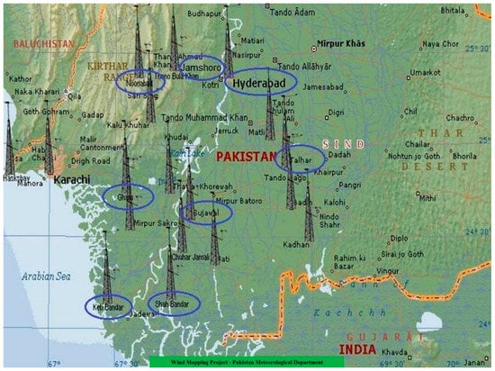 - Pakistan Meteorological Department. WIND ENERGY PROJECT. Available online: http://www.pmd.gov.pk/wind/Wind_Project_files/Page406.html (accessed on 25 April 2018).