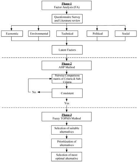 The AHP and FTOPSIS methods are two key methodology pillars of this study’s research framework. The AHP and TOPSIS methods are the techniques of MCDM methods widely used in energy and environment planning and complex decision analysis [45]. The traditional assessment/analysis methods like environmental impact assessment (EIA), cost-effectiveness analysis (CEA), and cost-benefit analysis (CBA) are limited in nature and scope, and generally do not take care of social, risk, and uncertainty factors effectively [46]. Therefore, MCDM methods have found their greater application across various disciplines of engineering, social sciences, governance, and project management [47].