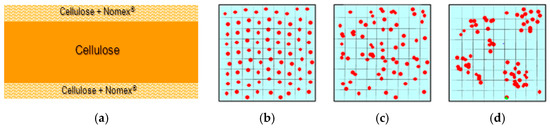 As shown in Figure 2, Nomex® T910 is a type of aramid-enhanced cellulose paper with a three-layer sandwich structure. The center ply is made of 100% cellulose, like normal Kraft paper, but the outer two plies are made of 50–70% cellulose blended with 30–50% aramid materials. Three plies are consolidated into a single sheet by a paper manufacturing processes such as wet forming, drying, and densification. The reason why T910 has higher thermal performance than cellulose paper is that the aramid fiber can enhance the thermal stability of the cellulose paper, and the fiber ratio between aramid fiber and cellulose fiber will determine its performance. The dispersal states will be different when the ratios of aramid fiber and cellulose fiber are different, as shown in Figure 2.