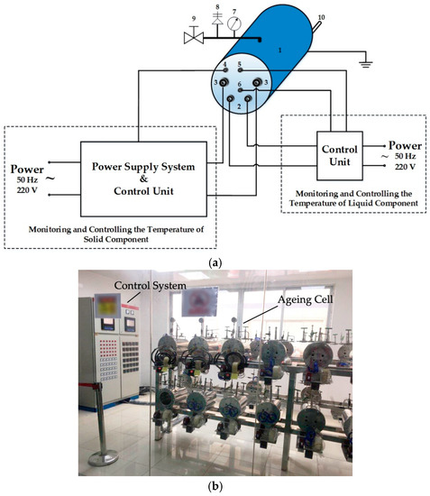 Dual-temperature thermal aging platform: (a) schematic diagram (1, aging cell; 2, immersion heaters for liquid; 3, copper conductor; 4, temperature sensor for solid component; 5, temperature sensor located at liquid surface; 6, temperature sensor located at liquid center; 7, barometer; 8, relief valve; 9, gas valve; 10, liquid pipeline); (b) photo.