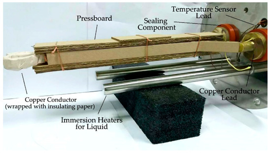 As shown in Figure 4, the dual-temperature test platform includes an aging cell, power supply system, heating elements, control system, safety protector, and sampling unit. The aging cells in the tests were modified based on IEC 62332-1 [11], as labeled in Figure 5. The outer diameter of the cell is 220 mm and the length is 420 mm. The aging cell consists of both an insulating oil–paper test object sample and corresponding heaters and sensors, in which temperature monitoring of solid and liquid materials is separately realized by the copper conductor and immersion heaters coordinating with their individual thermal sensors. The insulating oil circulates in the aging cell due to the temperature difference to simulate the oil flow in transformers.