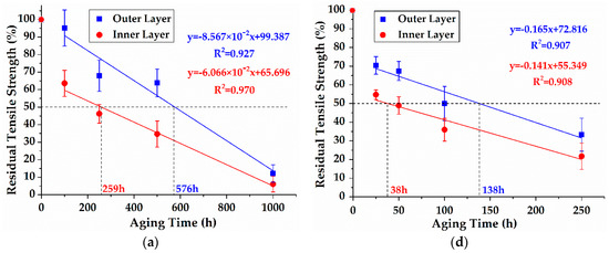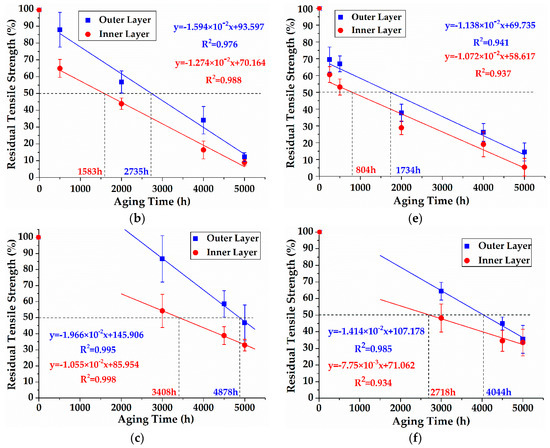 Residual tensile strength of T910 in FR3 and Kraft in mineral oil at different temperatures: (a) T910 at 180 °C; (b) T910 at 165 °C; (c) T910 at 150 °C; (d) Kraft at 160 °C; (e) Kraft at 140 °C; (f) Kraft at 125 °C.