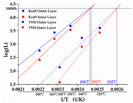 The initial tensile strength of each sample has been treated as 100% as the initial point before thermal aging process. During the first stage of each aging test, the RTS between the initial point and the first measured point dropped apparently, even more with an increase in temperature. For the comparison between the two layers, the RTS of the inner layer dropped more than that of the outer layer. Furthermore, the scatter points without the initial one are fitted linearly by the method of least squares to determine the lifetime of each insulation system under different aging conditions. As normal practice, the lifetime will be considered as the ageing time when the tensile strength dropped to 50% of the initial tensile strength. The results of lifetime under each aging temperature are listed in Table 4. The lifetime of the outer insulating paper is higher than that of the inner layer under the same aging temperature due to the difference of heat dissipation situation. The outer layer contacted with insulating oil directly, which leads to a better heat dissipation situation. As expected, the lifetime decreases with the increase of the aging temperature for both insulation systems. However, the lifetime of T910 is still much higher than that of Kraft paper, even under higher aging temperature, which illustrates a relatively better thermal capability.