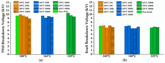 Dielectric strength is also one of the important properties of insulation paper, which directly provides insulation protection for winding. The breakdown voltages of insulating paper under different temperatures in different aging cycles were measured and plotted, as shown in Figure 9. Since the insulation paper was wrapped on a copper conductor, creases are unavoidable on its surface. In order to reduce the influence of creases on the breakdown voltage of insulation paper, the VDE electrode was adopted for step-up voltage tests with 50 Hz power supply frequency and 0.5 kV/s step-up speed. In these tests, T910 was placed in preconditioned FR3, and Kraft was placed in preconditioned mineral oil. The breakdown voltage of each sample was measured 20 times. All results were plotted by Weibull distribution, and the value with 63.2% breakdown probability was considered as the final result. Considering that the thickness of both candidate insulating papers are the same, their breakdown voltages can be directly compared.
