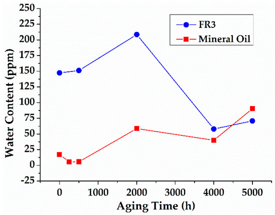 According to a related study, the breakdown voltage of mineral oil is more sensitive to water content compared with natural ester [24]. For example, the saturated water content of mineral oil is about 68 ppm, and that of FR3 is about 1100 ppm at 25 °C [29]. The water molecule within the mineral oil will be released once the water content increases to the limit, which brings the potential risk of breakdown. Compared with absolute water content, relative water content is meaningful as a reference that can be calculated by the ratio of water content to saturated water content. With the increase of water content, breakdown voltage dropped significantly for both FR3 and mineral oil [24,30]. From Figure 10, after aging at 165 °C, it was observed that the water content of FR3 increased from 151.2 ppm after 200 h to 208.6 ppm after 2000 h, then decreased to 57.9 ppm after 4000 h. At the same time, the breakdown voltage of FR3 first decreased from 45.5 kV to 39.2 kV and then increased to 41.6 kV.