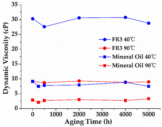 where is dynamic viscosity, and are constants depending on the particular polymer–solvent system, and is the average molecular weight. In this paper, the dynamic viscosity of insulating oil was measured by a Brookfield LV-II pro viscometer fitted with a small sample adapter under 40 °C and 90 °C. Figure 11 shows the viscosity of oil under different thermal aging conditions: 165 °C for T910 and 140 °C for Kraft. The dynamic viscosity of FR3 is significantly higher than that of mineral oil at the two temperatures, based on the relative molecular weight of triglyceride, which is a potential bottleneck for natural ester to be adopted in a liquid-immersed transformer. In this paper, the nitrogen protection of aging cells narrowed the variance of viscosity due to the limited oxygen reaction.