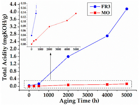 The acidity of insulating oil speeds up the aging process of insulating paper, because hydrolysis of cellulose is catalyzed by H+ [26]. In this paper, the acidity of insulating oil was measured by potentiometric titration with KOH isopropanol solution by Metrohm 848 Titrino plus equipment (Metrohm, Herisau, Switzerland). Considering the same pattern will be followed for acidity under different thermal aging temperatures, Figure 12 shows the total acidity of insulating oil under a typical aging temperature as an example.