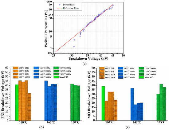 Breakdown voltage tests were conducted with a BAUR DTA 100C breakdown voltage machine (BAUR GmbH, Sulz, Austria), with reference to ASTM D1816 [28]. Step-up voltage tests were conducted with a 50 Hz power supply frequency and 0.5 kV/s step-up speed; the distance between electrodes was 1 mm. For each insulating oil sample, the breakdown voltage tests were conducted 50 times at room temperature after each thermal aging cycle. All results were plotted by Weibull distribution, and breakdown voltage under probability equal to 63.2% was set as a benchmark, as shown in Figure 13.