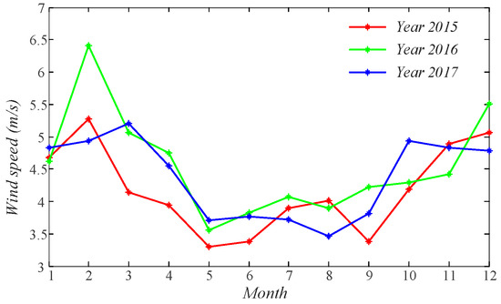 The monthly averaged wind speed of datasets in years 2015–2017.