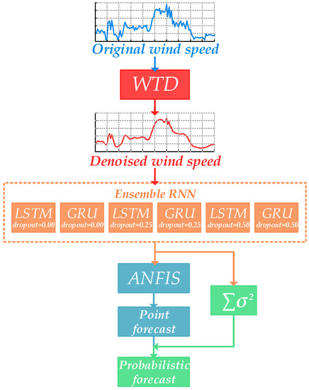 The probabilistic wind speed forecasting model proposed in this study consists of WTD, RNN and ANFIS. Firstly, WTD is used to decompose and smooth historical time series of wind speed in order to reduce its volatility. In that case, it is easier for a forecasting model to capture the variation trend of wind speed. Secondly, six RNNs with dissimilar architectures and parameters, namely sub-models, are established and trained for prediction. Thirdly, an ANFIS is utilized as the top layer of the ensemble model. The outputs of those RNNs are entered into the ANFIS and the final forecasting result is attained from its output. Finally, variances are gathered from different sub-models, along with errors between the final predicted value and the actual value, so prediction intervals of different confidence levels can be calculated. The structure of the entire WTD-RNN-ANFIS model is shown in Figure 2.