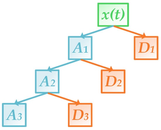 Mallat algorithm is commonly used for DWT, where scale functions and wavelet functions are operating as low and high pass filters, respectively. The multi-level decomposition of the algorithm is shown in Figure 3. After decomposition, approximation and detail components are obtained, which contain low-frequency and high-frequency information, respectively [41]:
