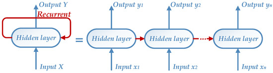 RNN has a strong power to handle a sequence with temporal correlation and it has been widely utilized in solving time-varying problems [42,43], especially natural language processing [44]. Unlike a common neural network that has no connections within hidden layers, RNN is able to connect hidden layers with the former ones circularly. Those hidden layers of RNN, which are also named recurrent units, can save historical information from the sequence. The sequential structure of a one-hidden-layer RNN is shown in Figure 4. It can be unfolded to several networks with hidden layers connected, each of which has a point input of a sequence. Therefore, a RNN possesses an extremely deep architecture, the number of whose hidden layers is equal to the length of input sequence.