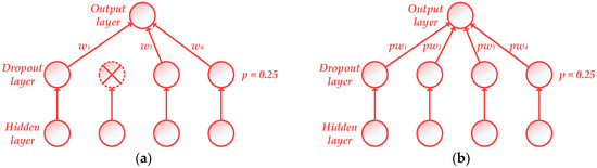 A dropout layer with rate p = 0.25. (a) dropout during the training phase; (b) dropout during the testing phase.