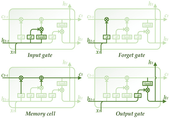 A simple RNN shown in Figure 4 has numerous connections between current and previous hidden layers. Thus, training such a network becomes quite difficult, where the vanishing gradient problem will arise. In order to overcome the problem, LSTM was proposed in 1997 [48,49] and has been improved during the recent rapid development of deep learning technology [50]. It is a building unit for layers of RNN, which is able to remember short-term memory that lasts for a long period of time. The structure of a LSTM block is presented in Figure 6, which consists of four major parts, namely input gate, forget gate, memory cell and output gate.