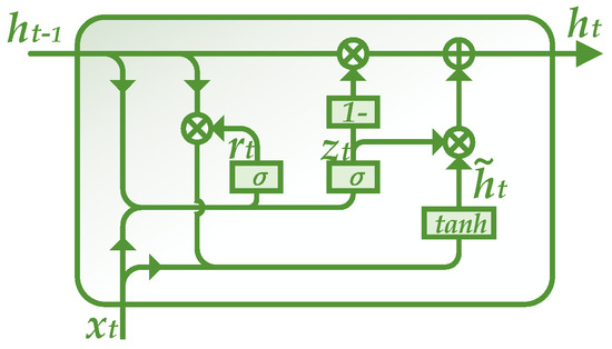 GRU, which is a recently proposed architecture of RNN, is a simplified variant of LSTM [51]. There are mainly two changes in GRU. First, the input and forget gates of LSTM are merged in the model, producing a sole update gate. Second, the two lines in LSTM, that is, the memory and the hidden layer, are also combined together. The integrate structure of GRU is shown in Figure 7. The following equations are designed for calculations in GRU [52]: