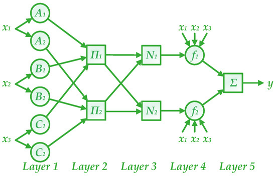 Based on the architecture of ANFIS-FCM in Figure 8, there are five layers in this model and their computation formulas can be described as follows [56].