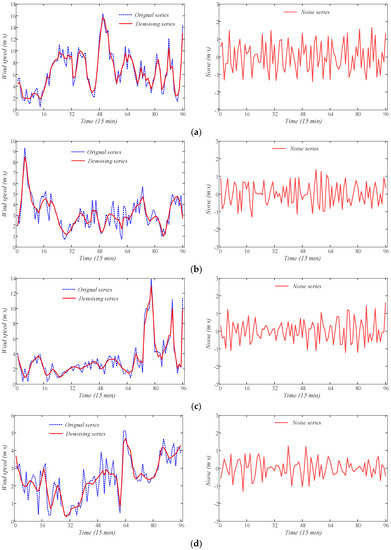 The denoising results of wind speed series using WTD. (a) 1 March 2016; (b) 1 June 2016; (c) 1 September 2016; (d) 1 December 2016.