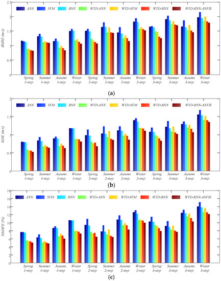 In this study, the proposed WTD-RNN-ANFIS model is validated on forecasting wind speed under multi-step-ahead situations, that is, 1-step-ahead (15 min), 2-step-ahead (30 min) and 3-step-ahead (45 min). It is compared with three-layer ANN, SVM, RNN, WTD-ANN, WTD-SVM and WTD-RNN. Specially, the performance criteria in WTD-RNN are the averaged values of the six sub-models in the proposed WTD-RNN-ANFIS, in order to validate the ensemble method that is based on ANFIS. Besides, as mentioned before in Section 2, the wind speed data at 22 March, 23 June, 22 September and 23 December in 2017 are chosen as four testing cases of different seasons.