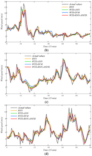 The point forecasting results are presented in Table 4, where the best criteria of each case are emphasized in bold and the comparisons of those criteria are shown in Figure 10. From the results, it can be found that WTD is a great pre-processing method in wind speed forecasting, as it reduces the uncertainties of wind speed variation. The comparisons indicate that SVM performs worse than ANN and RNN. Besides, SVM costs rather long computation time when trained on a large number of training samples, which is not suitable for online training of short-term forecasting. It is noted that RNN usually achieves better performance than ANN whether or not WTD is utilized. The proposed WTD-RNN-ANFIS obtains the best forecasting results in all four cases. Therefore, it is a perfect ensemble model for short-term wind speed forecasting rather than just calculating an averaged output from different sub-models. Moreover, the prediction curves of 1-step-ahead point forecasting using several representative models are presented as examples in Figure 11. The curve of the proposed WTD-RNN-ANFIS fits the actual value best, which denotes the superb point forecasting performance of the model.