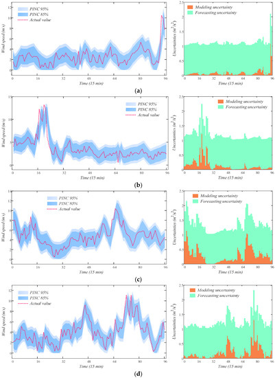 The prediction intervals of 1-step-ahead probabilistic wind speed forecasting using WTD-RNN-ANFIS. (a) Spring; (b) summer; (c) autumn; (d) winter.