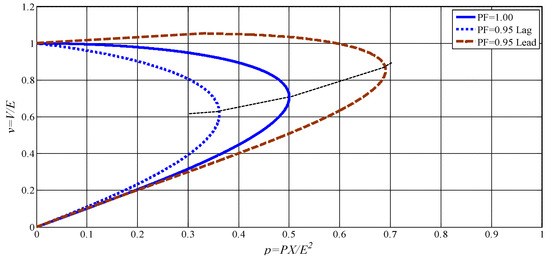 By increasing load power demand, the absolute value of impedance reduces and the current in the receiver node, Ir, increases. Figure 2 is a general approach that can be used to define the stability margin. The relation between normalized voltage and power variables is shown in Equation (5) [24]. This equation is used to obtain the V-P curve for the two-node system of Figure 1.