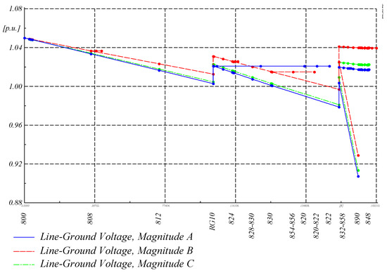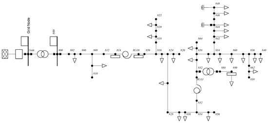 In order to implement the proposed voltage stability method, the IEEE 34 node test system that is shown in Figure 5 [26] was considered. This system has technical specifications, like unbalance characteristics, four lines, two voltage regulators, and a load with ZIP properties.