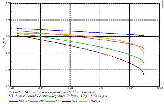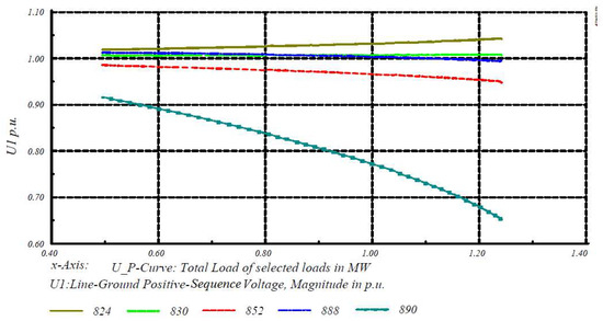 Voltage stability analysis was performed using DIgSILENT software. Figure 6 shows the voltage profile of the network with an industrial voltage level of 24.9 and 4.16 KV. Figure 7, Figure 8, Figure 9 and Figure 10 show the V-P curves for the weakest nodes of the IEEE 34 node test system. In this regard, in order to derive V-P curves, positive sequence components of voltage according to power variations were calculated. The obtained results indicate that the weakest V-P characteristics appear in node 890. As mentioned, the worst case is related to node 890. The main reasons are further distance of the node from reference node (# 800) and nonaccessibility of the node to the capacitor bank at the end of network.