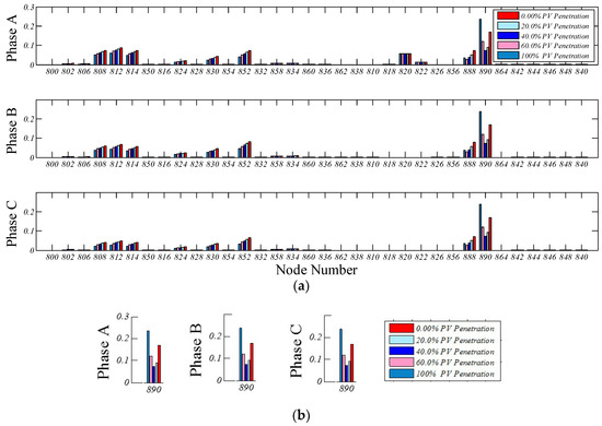 The stability criterion, Lk (a) for all nodes and for (b) node 890 in IEEE 34 node feeder with various PV penetration.