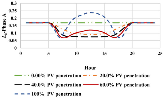The value of the stability criterion of phase A, Lk, in various PV penetration levels for node 890.