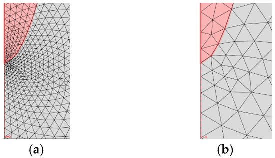 Meshing of needle electrode in field simulation. (a) manually with finer mesh than the finest automatic meshing; (b) automatic with “extra fine” mesh.
