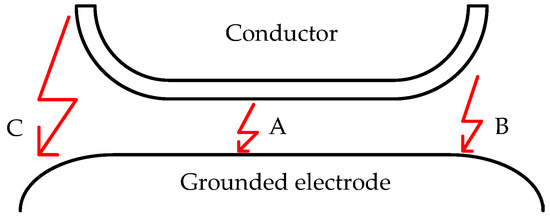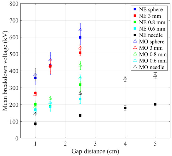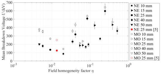 Figure 4 shows mean breakdown voltage versus gap distance; Figure 3 shows mean breakdown field strength over the investigated range of inhomogeneity. Field strengths during an ongoing discharge can be a lot higher than the calculated ones due to space charges depending on the distance of the streamer tip from the electrode and the diameter of the streamer. This effect was investigated in [20,21,22,23,24,25].