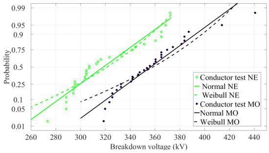 Breakdown results for conductor test at positive polarity, normal distribution fitting for mineral oil (MO) and natural ester liquid (NE).