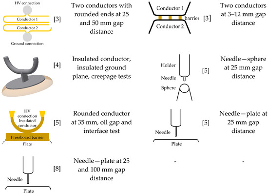 Comparisons to further test arrangements and studies investigating natural ester liquids and mineral oils at inhomogeneous field arrangements under impulse voltages are drawn to support data interpretation. Performed test study can therefore be compared to a larger database. The following studies are compared to the two analyzed setups in this contribution: [3,4,5,8,28,29]. First comparisons are drawn on the different electrode arrangements selected. Self-provided simplified drawings of the arrangements used are shown (if available) in Figure 9.