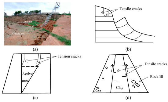 Compared with widespread shear failure phenomena such as soil slope slip and foundation instability, tensile fracture is relatively imperceptible in geotechnical engineering. However, this is not to say that the tensile strength of the soil is not important. As explained below, tensile failure tends to have an adverse effect on engineering. Shrinkage cracks caused by desiccation (Figure 1a) may affect the stability of the structures founded on soils [3]. A tensile crack produced on the upper surface of a shallow slope (Figure 1b) may induce a landslide. Furthermore, if water accumulates in tensile cracks, a landslide disaster may accelerate [4,5]. Vertical cracks may form behind a retaining wall due to active earth pressure (Figure 1c) when the soil is under the state of limit equilibrium. Tensile stress is determined by (c-cohesive strength, Ka-rankine active earth pressure coefficient). During the rainy season, cracks will form permeation channels which are unfavorable for the safety of the retaining wall. In an earth rockfill dam, since the consolidation rates of clay and rockfill are different, friction will be generated (Figure 1d), which will then cause horizontal tensile cracks that pose a potential threat to the seepage of the dam. Therefore, it is essential to analyze and research the tensile characteristics of soil for the prevention and control of engineering hazards.