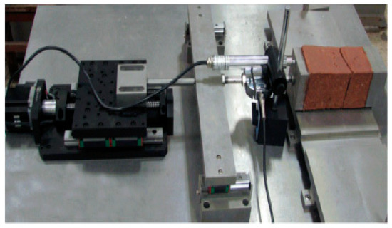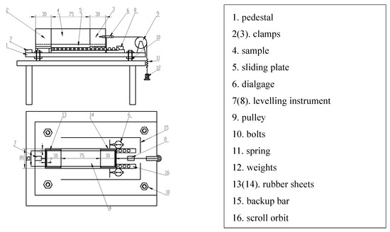 - Sample installation and instrument debugging: the specimen was placed on the apparatus and then glued to the front and rear clamps using epoxy adhesive. The levelling bubble was situated in the center by minor adjustments of the height of four bolts. The dial gauge was installed and settled to zero. Before the test, 2 min was allowed to let the adhesive solidify. The whole course was carried out in an 18 °C constant temperature room, and thin vaseline was daubed on the specimen surface to prevent evaporation.