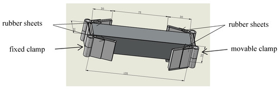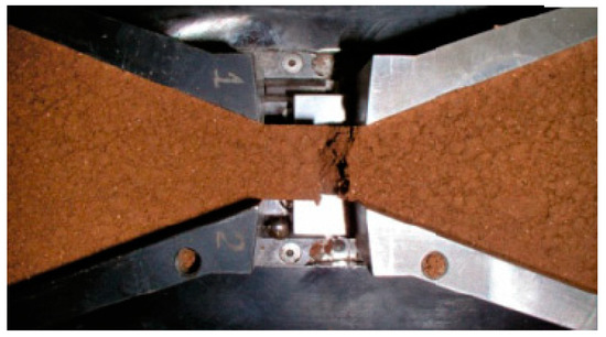 The newly designed stress-controlled uniaxial test apparatus is shown in Figure 2. It consists of two clamps and an axial loading system. The clamps include a fixed one and a movable one placed on a horizontal platform. The loading system is driven by weights. Three problems have been discussed emphatically in the course of the design of the device: (1) the problem of the connection of the sample end and the instrument. There are two types currently, including direct connection and clamp connection. The first entails the end being connected with the loading system by glue, which can only connect the cross section of the specimen (Figure 3) [26]. Although this is relatively simple, the specimen falls off easily when the bonding force of the glue is less than the tensile force, which results in the failure of the test. The second is to employ specific clamps, ensuring that the sample does not disengage at the end. As these clamps’ internal spaces are certain, this not only increases the difficulty of installation of the specimen but also brings about stress concentration at the end. Stress concentration will cause the specimen to fracture at the edge of the clamp (Figure 4) [29]. In this case, the measured tensile strength is usually smaller than the actual value. According to the above discussion, two new rectangular clamps were designed. The homogeneity of the cross section can also reduce the stress concentration on the surface of the specimen. As shown in Figure 5, the left and right sides of the clamps can freely unfold because of the design of the hinge, and 2-mm-thick rubber sheets were mounted on the inner sides of the clamps. This reduces the difficulty of the samples’ installation and improves the efficiency of the test. Epoxy adhesives were applied to each inner surface of the rubber sheets, which not only avoids stress concentration due to the extrusion between the clamp and the specimen end but also increases the bonding surfaces. The test results showed that most of the specimens would break into two pieces near the middle position (30–105 mm). Therefore, the effectiveness of the clamps was confirmed. In addition, the rubber sheets can be replaced after the test, thus avoiding the pollution of the glue to the instrument. One clamp is fixed on the apparatus and the other movable clamp can move freely along the guide rail with the ‘v-type’ guideway. (2) The influence of the bottom friction. There is no doubt that the existence of friction will cause the experimental value to be large. In order to reduce the friction of the rectangular soil specimen, two rows of uniformly distributed balls were laid along the axial direction, and one flat plate with the same v-type guideway was placed on it. At present, most test apparatuses apply this design [19,27]. (3) The influence of eccentric tensile stress. To obtain accurate uniaxial stress, the eccentricity of the specimen must be avoided. First, because of the directionality of the guide rail, the axial tension of the specimen can be largely satisfied. Then, considering the flatness of the instrument platform, four adjustable bolts and two leveling bubbles were designed. The horizontal plane of the apparatus can meet requirements by slightly adjusting the height of bolt. In this way, there is no need to over-require the flatness of the desktop under the instrument, so that the test would not be confined to the laboratory and the use scope of the instrument has been expanded.