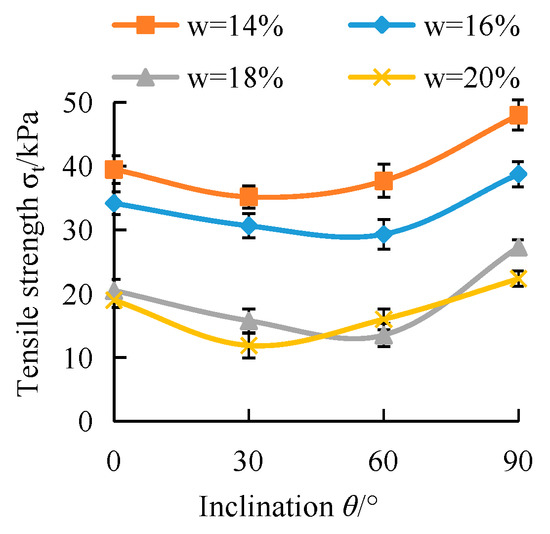 From the results shown in Figure 8, it can be seen that tensile strength of undisturbed loess is significantly affected by anisotropy. We set the counterclockwise direction as positive. With the increase in inclination θ, there is a decrease in σt firstly, reaching a minimum in the range of 30° < θ < 60°. For the condition of the same dry density and water content, the tensile strength of the vertical direction is greater than that in any other direction in the process of changing from horizontal (0°) to vertical (90°). It is reasonable to assume that the original loess forms a higher primary structure strength in the vertical direction due to the gravitational field which causes the tight bonding of soil particles in the history of accumulation and deposition. The passive lateral force is smaller than gravity by the extrusion of soil particles, which forms the weaker primary structure strength in the other directions [37]. The highest peak stress (i.e., σt) is obtained when the tensile stress direction is parallel to the deposition direction (i.e., θ = 90°).